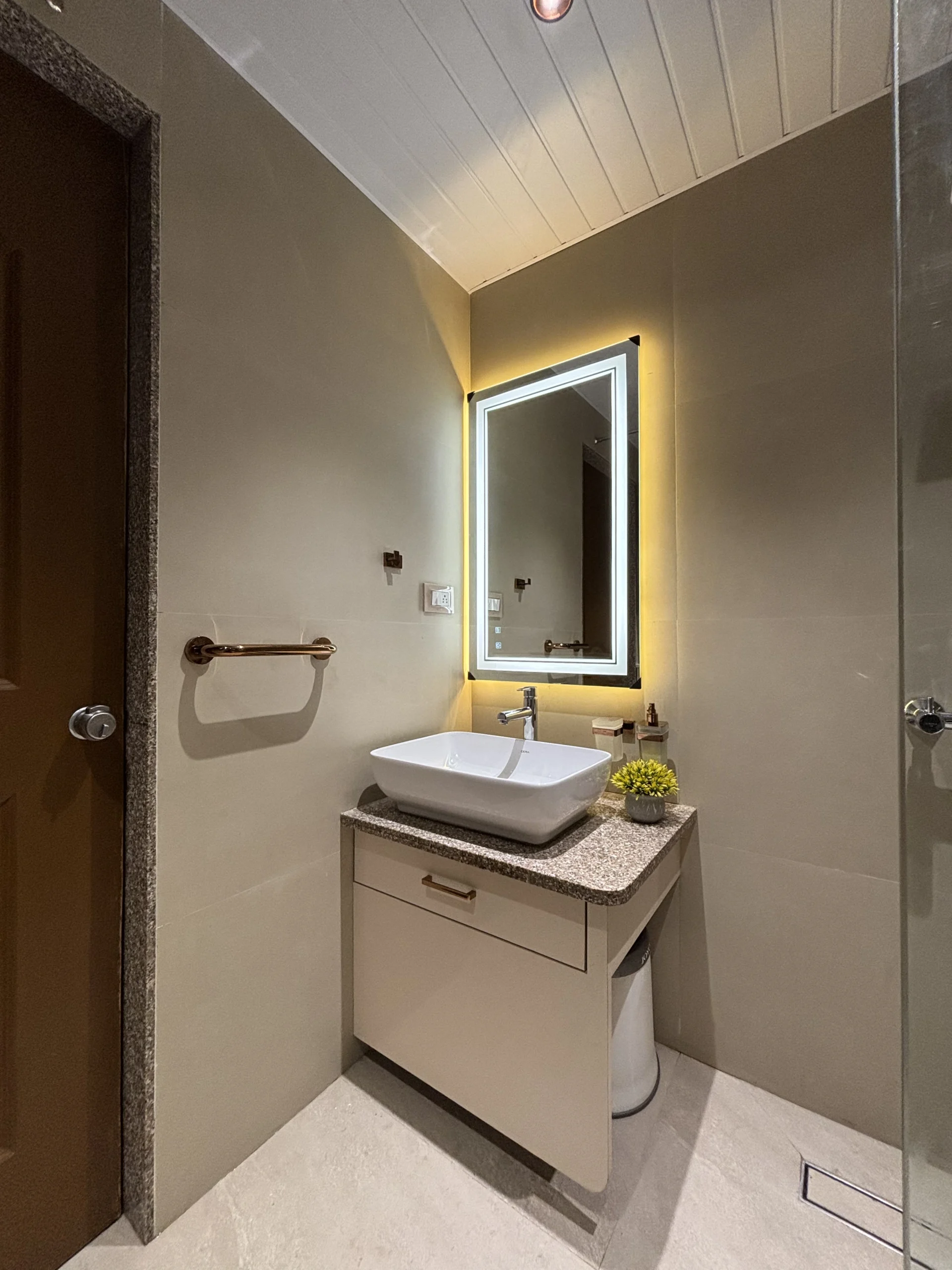Vanity & Storage Solutions : It will feature floating vanity with storage drawers and a mirror cabinet with LED lighting.